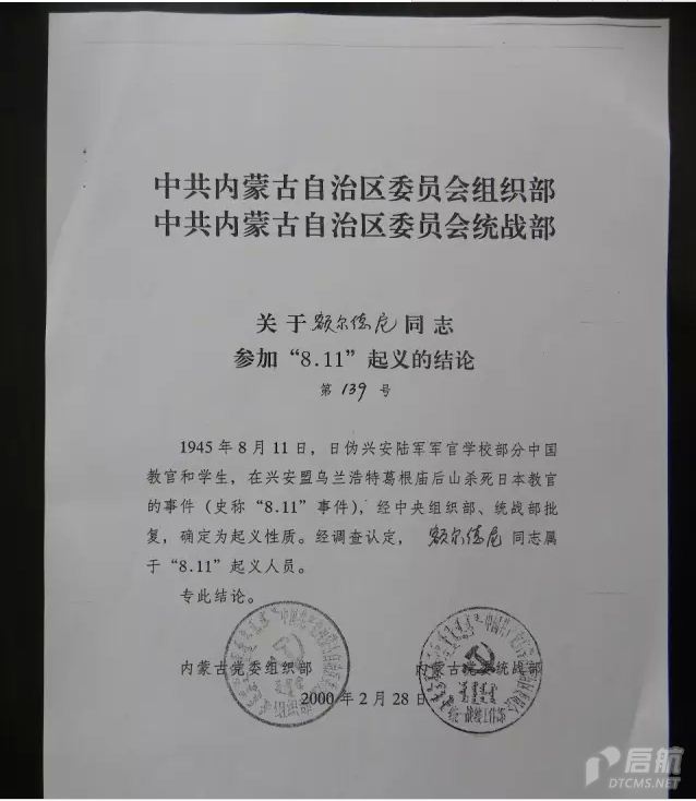 2002年2月中共内蒙古自治区委员会组织部、统战部联合发文,经中共中央组织部和统战部批复,认定宝音孟和同志属于“8.·11”起义人员,属抗日战争参加革命。