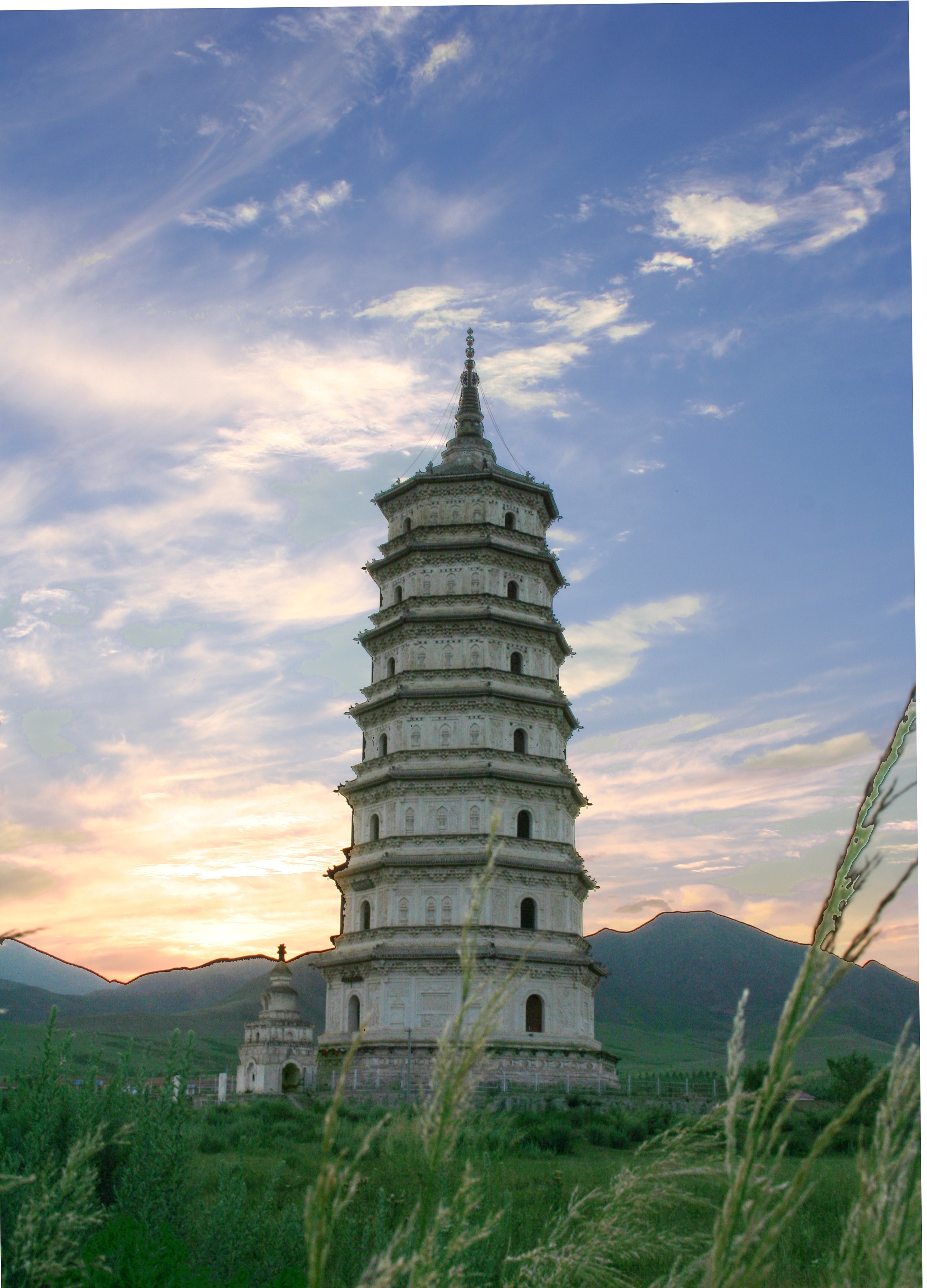 ----辽庆州白塔,是一座造型玲珑秀美、浮雕精湛细腻、规模宏伟壮观,为八角七级,通高73.27 米的砖木结构拱阁式塔。始建于“重熙十六年二月(1047年)”,竣工于“重熙十八年七月十五日(1049年)”。为辽兴宗耶律宗真之生母“章圣皇太后”特建。塔的外观整体洁白如玉,挺拔秀美,座置平原,直插蓝天,背靠青山,面对白水(查干沐沦)。