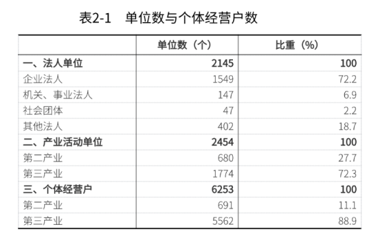 2023年末,全旗共有从事第二产业和第三产业活动的法人单位2145个,比2018年末增加529个,增长32.7%;产业活动单位¹2454个,增加552个,增长29.0%;个体经营户6253个(详见表2-1)。