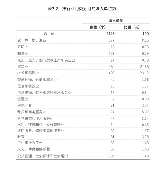 在第二产业和第三产业法人单位中,位居前三位的行业是:批发和零售业496个,占23.12%;建筑业469个,占21.86%;公共管理、社会保障和社会组织296个,占13.8%(详见表2-2)。