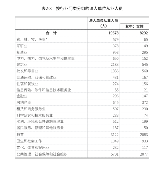 在第二产业和第三产业法人单位从业人员中,位居前三位的行业是:公共管理、社会保障和社会组织5701人,占29.0%;教育3122人,占15.9%;建筑业2183人,占11.1%(详见表2-3)。