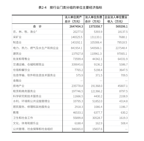 注:表中农、林、牧、渔业仅包括从事农、林、牧、渔专业及辅助性活动的单位数据。表中企业法人单位,包括机构类型为企业的法人单位,以及执行企业会计制度的事业法人单位、民办非企业法人单位和基金会,农民专业合作社,农村集体经济组织和除宗教活动场所以外的机构类型为其他组织机构的法人单位。表中房地产业包括房地产开发经营、物业管理、房地产中介服务、房地产租赁经营和其他房地产业。表中不包含铁路部门、金融部门监管企业数据。
