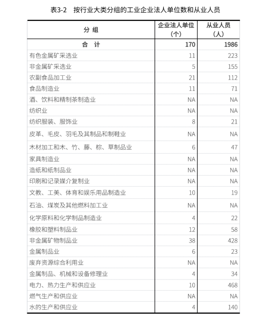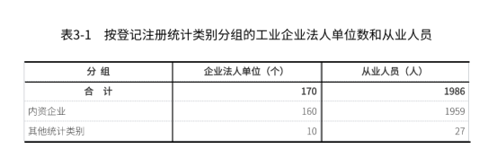 在工业企业法人单位中,采矿业16个,制造业137个,电力、热力、燃气及水生产和供应业17个,分别占9.4%、80.6%和10.0%。在工业行业大类中,非金属矿物制品业、农副食品加工业、橡胶和塑料制品业企业法人单位数位居前三位,分别占22.4%、12.4%和7.1%。