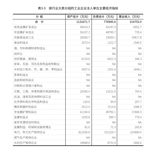 在工业企业法人单位从业人员中,采矿业378人,制造业958人,电力、热力、燃气及水生产和供应业650人,分别占19.0%、48.2%和32.7%。在工业行业大类中,电力、热力生产和供应业、非金属矿物制品业、有色金属矿采选业从业人员数位居前三位,分别占23.6%、21.6%和11.2%(详见表3-2)。