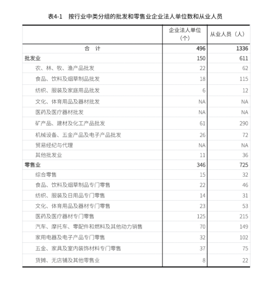 在批发和零售业企业法人单位中,批发业占30.2%,零售业占69.8%。在批发和零售业企业法人单位从业人员中,批发业占45.7%,零售业占54.3%(详见表4-1)。