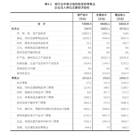 2023年末,批发和零售业企业法人单位资产总计73599.4万元,比2018年末增长75.6%;负债合计44342.1万元,比2018年末增长48.8%。