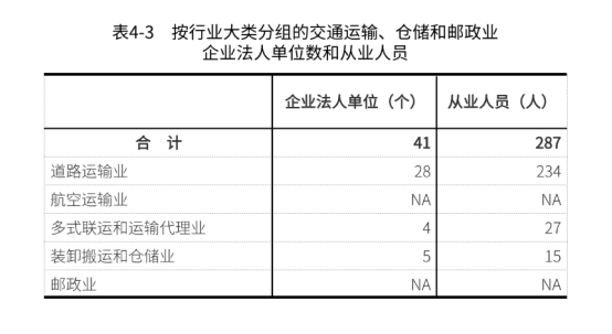 2023年末,全旗共有交通运输、仓储和邮政业企业法人单位41个,全部为内资企业,从业人员287人,分别比2018年末增长28.1%和16.2%(详见表4-3)。