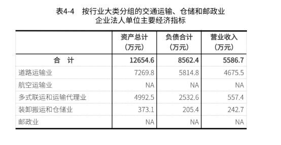 2023年末,交通运输、仓储和邮政业企业法人单位资产总计12654.6万元,比2018年末下降2.8%;负债合计8562.4万元,比2018年末增长64.3%。