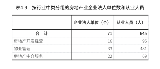 2023年末,全旗房地产业企业法人单位从业人员645人,比2018年末下降3.0%。其中,房地产开发经营企业95人,比2018年末下降52.5%;物业管理企业481人,房地产中介服务企业69人,分别比2018年末增长16.7%和68.3%(详见表4-9)。