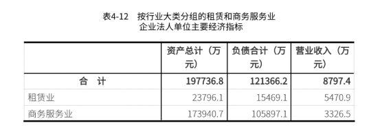 2023年末,租赁和商务服务业企业法人单位资产总计197736.8万元,比2018年末增长709.2%。其中,租赁业企业法人单位资产总计23796.1万元,商务服务业企业法人单位资产总计173940.7万元,分别比2018年末增长34.7%和2482.1%。租赁和商务服务业企业法人单位负债合计121366.2万元,比2018年末增长781.6%。