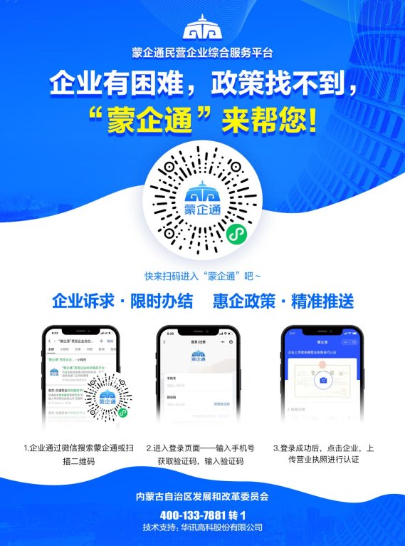 “蒙企通”综合服务平台是按照自治区政府部署,自治区发改委牵头建立的民营企业综合服务平台,平台有“企业诉求”“政策推送”“问卷调查”“数据驾驶舱”四大核心功能,实现自治区级、盟市级、旗县区级三级数据互通互联,通过“宏观数据系统分析,提升企业发展水平,切实解决企业所急、所忧、所盼,不断满足企业日益增长的个性化、多样化需求”,有效打通企业与政府之间的沟通渠道,通过数据分析处理助推企业高质量发展。“蒙企通”平台主要为企业提供诉求受理解决、政策咨询答疑、卷调査等服务,并为各部门提供民营企业相关数据分析服务,是利用大数据技术服务民营企业发展的重要手段,是优化营商环境的具体举措。为进一步做好优化营商环境工作提供数据支撑,有效建立常态化政企沟通机制,提升营商环境服务水平和质量。