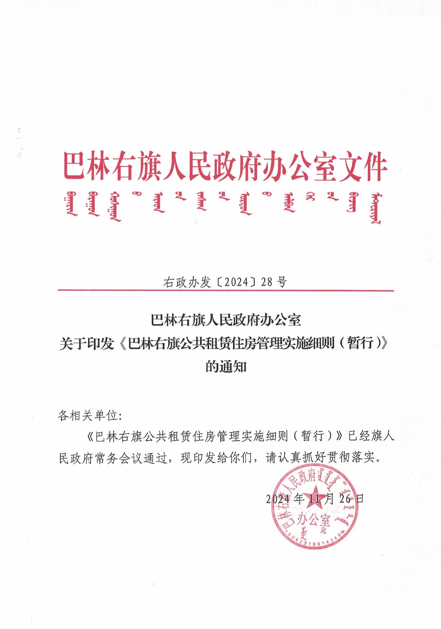巴林右旗人民政府办公室关于印发《巴林右旗公共租赁住房管理实施细则(暂行)的通知