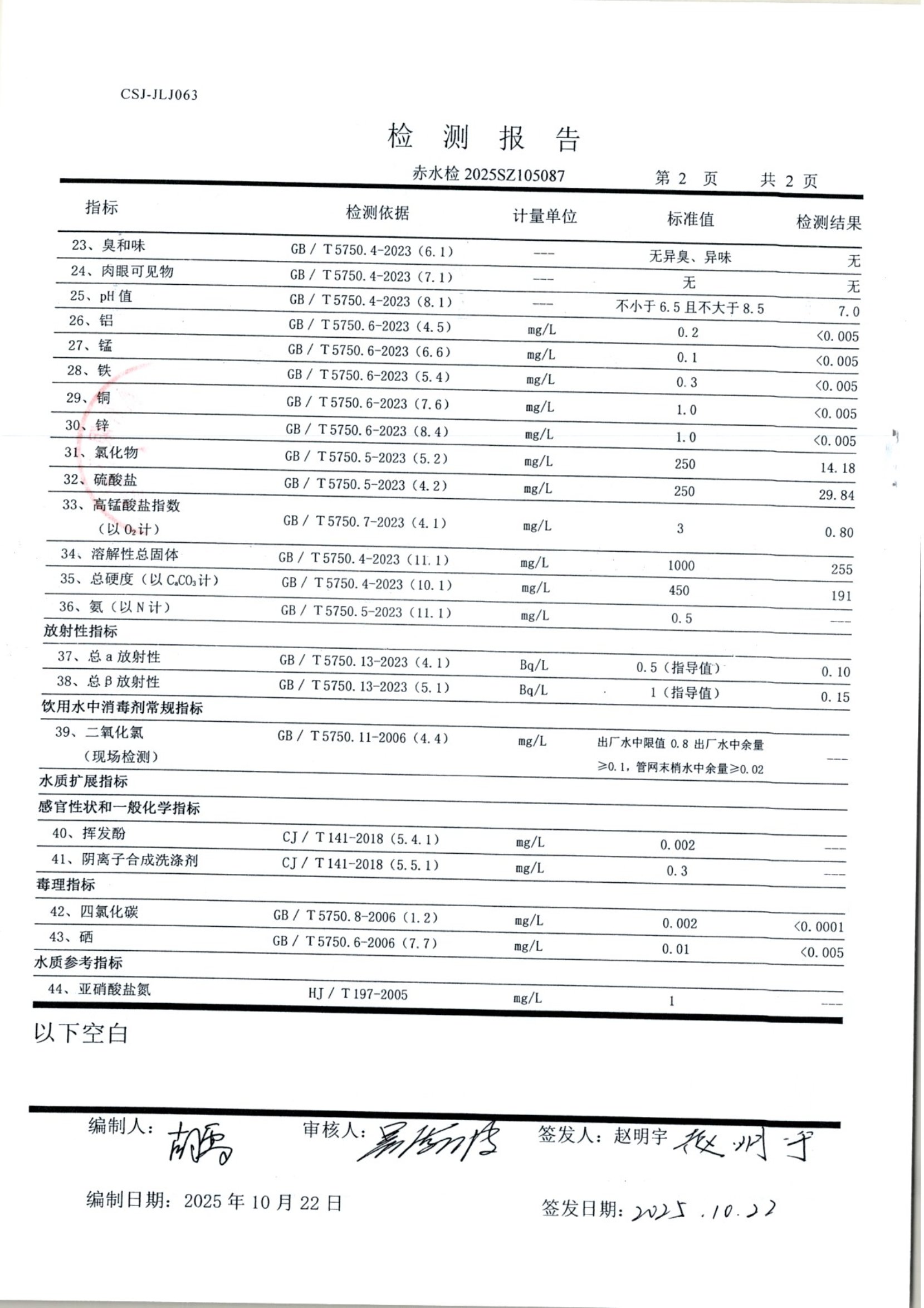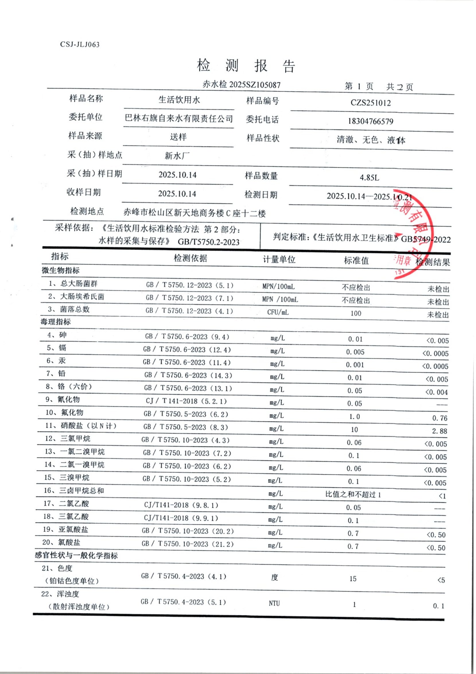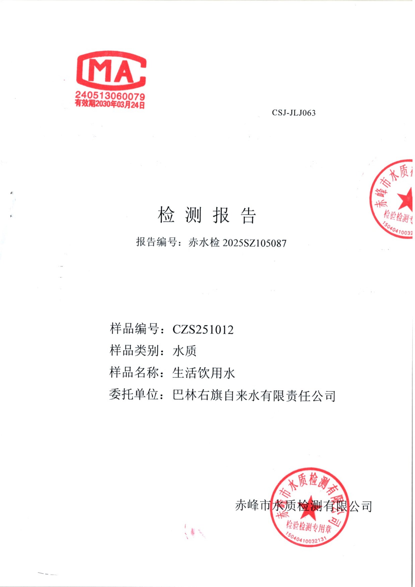 巴林右旗自来水有限责任公司2025年第四季度水质公示
