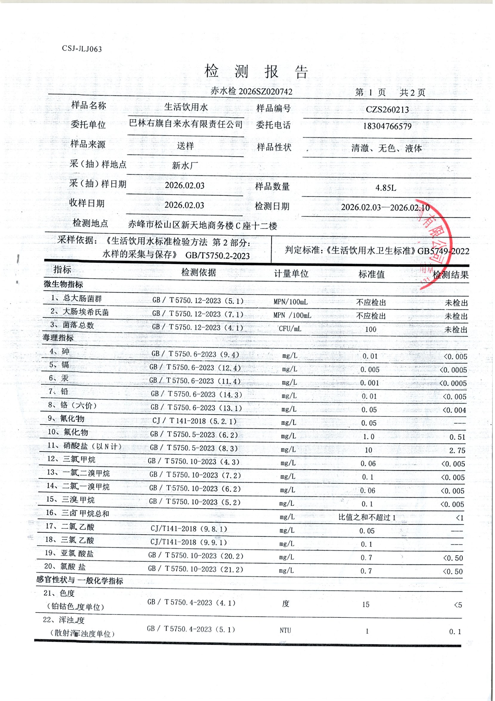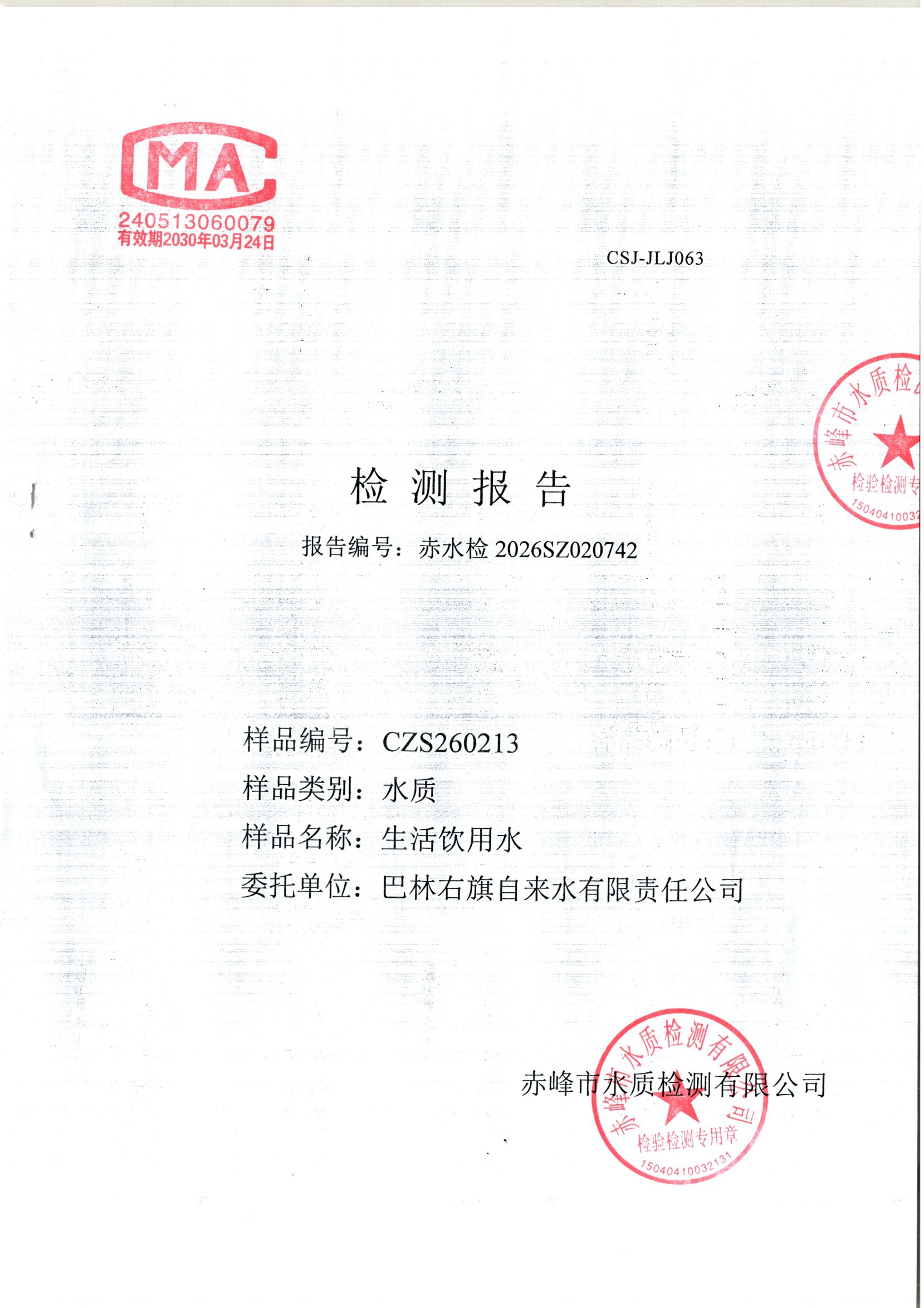 巴林右旗自来水有限责任公司第一季度水质公示