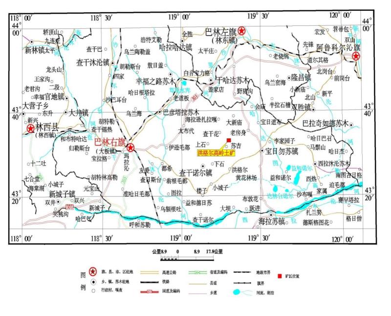 矿区位于巴林右旗旗政府所在地大板镇东50km,位于宝日勿苏镇北西17km,矿区经县道西可至大板镇,东可至宝日勿苏镇,矿区南距县道约14km,由砂石公路相通,另国道G303经过大板镇,交通较为方便(见交通位置图2-1)