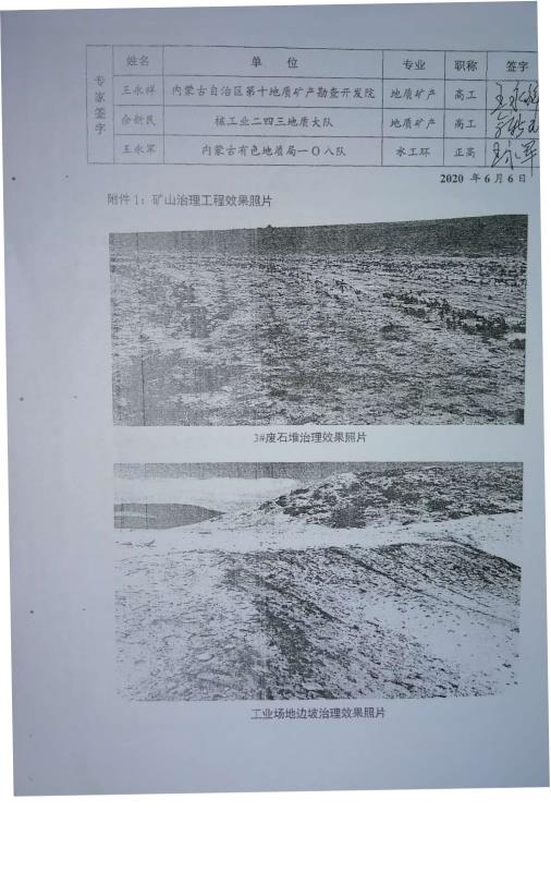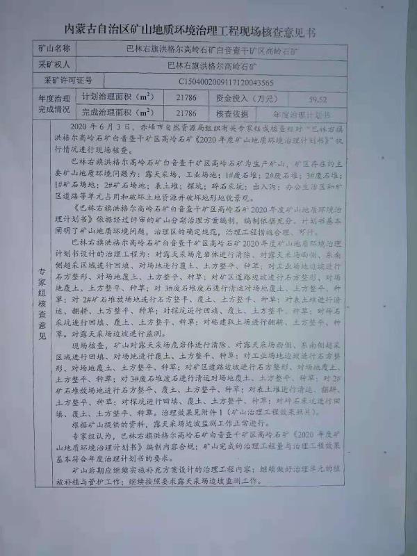2020年矿山地质环境治理工程100%完成,2020年6月3日,赤峰市自然资源局组织有关专家组成核查组对“巴林右旗洪格尔高岭石矿白音查干矿区洪格尔高岭石矿”《2020年度矿山环境治理计划》执行情况进行现场核查,于2020年6月6日专家组出具《内蒙古自治区矿山地质环境治理工程现场核查意见书》。完成治理资金59.52万元。
