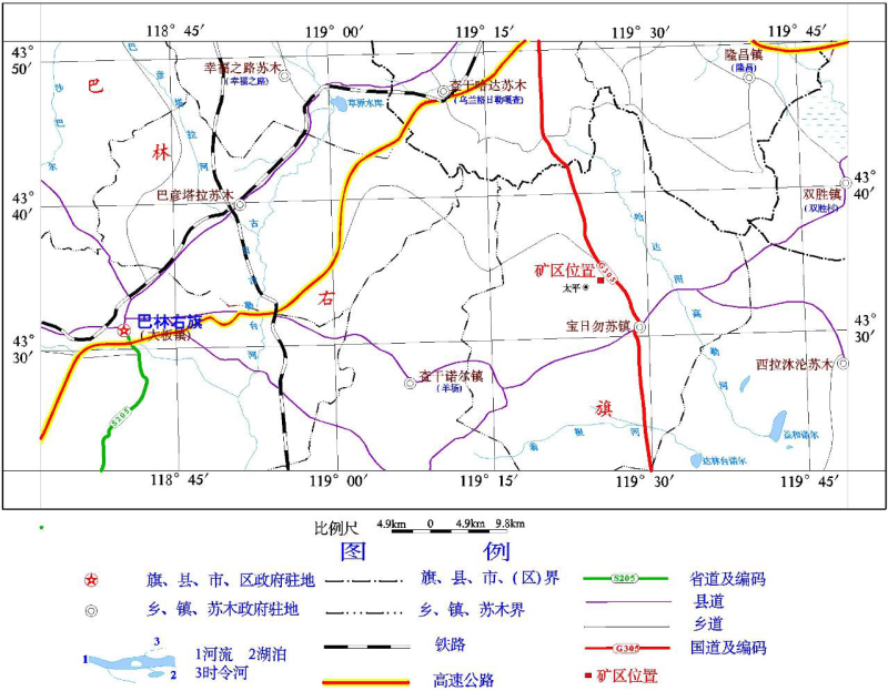 矿区位于巴林右旗政府所在地大板镇以东约63km,位于宝日勿苏镇西北方向8km,位于太平村东北方向约2km,位于国道G305西南方向约1km,由宝日勿苏镇到矿区有砂石路相通,交通较为方便(详见交通位置图2-1)。