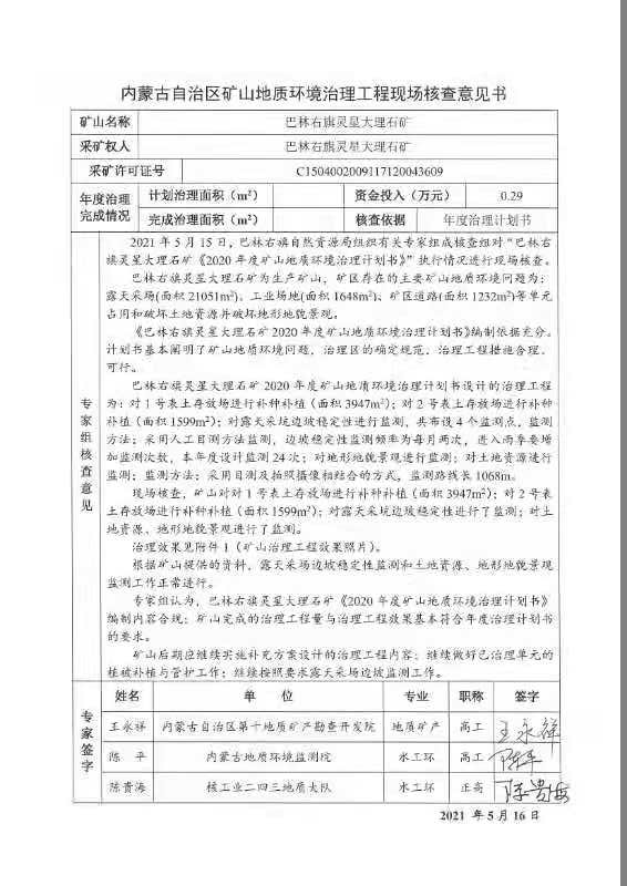 2020年矿山环境治理工程于2021年5月15日经专家组实地核查,得到核查专家的的肯定,并出具矿山地质环境治理工程现场核查意见。