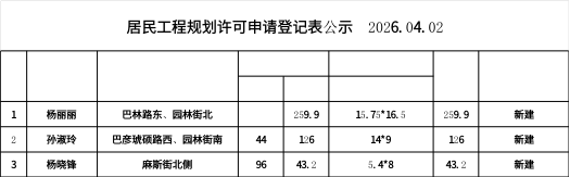 根据《关于城乡规划公开公示的规定》第二十条规定,我机构拟定对下列居民建设工程规划许可证审批,现予公示。如有异议,请自本公示发布之日起7个工作日内(2026年04月13日17:30前)将异议书面材料送达我机构。逾期无人提出异议或异议不成立的,我机构将依法办理建设工程规划许可证。