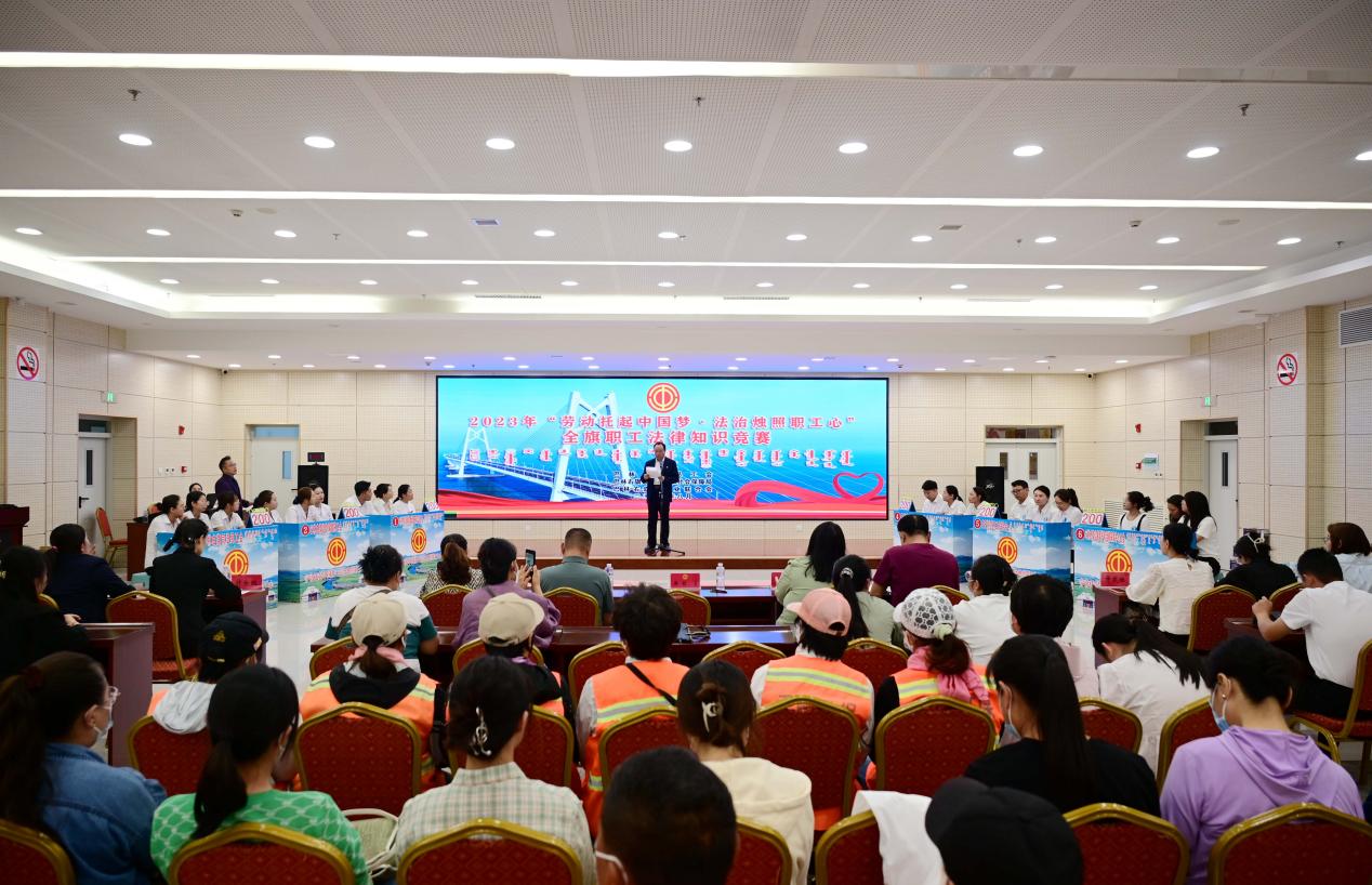 8月24日,巴林右旗总工会联合巴林右旗人力资源和社会保障局、巴林右旗工商业联合会举办2023年“劳动托起中国梦·法治烛照职工心”全旗职工法律知识竞赛。来自各苏木镇(街道)、旗直机关、企事业单位工会的24支代表队72名职工参加竞赛。巴林右旗总工会、巴林右旗人力资源和社会保障局、巴林右旗工商业联合会主要负责人出席活动。120余名基层工会干部和一线职工观看比赛。
