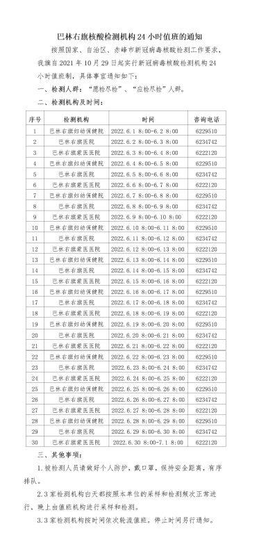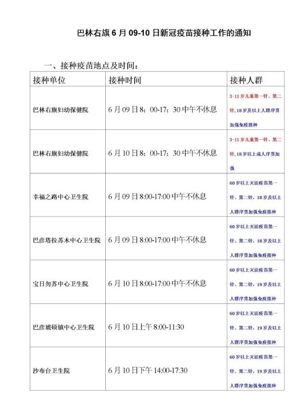 巴林右旗6月10日新冠疫苗接种、24小时核酸检测工作通知