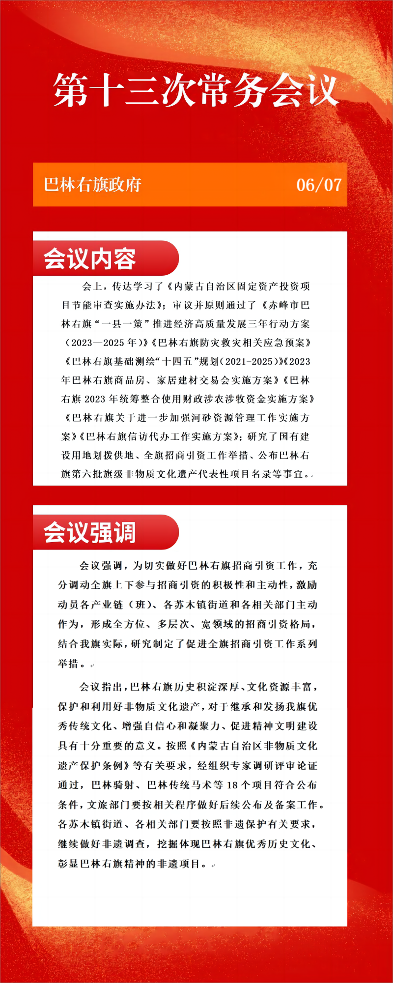 会上,传达学习了《内蒙古自治区固定资产投资项目节能审查实施办法》;审议并原则通过了《赤峰市巴林右旗“一县一策”推进经济高质量发展三年行动方案(2023—2025年)》《巴林右旗防灾救灾相关应急预案》《巴林右旗基础测绘“十四五”规划(2021-2025)》《2023年巴林右旗商品房、家居建材交易会实施方案》《巴林右旗2023年统筹整合使用财政涉农涉牧资金实施方案》《巴林右旗关于进一步加强河砂资源管理工作实施方案》《巴林右旗信访代办工作实施方案》;研究了国有建设用地划拨供地、全旗招商引资工作举措、公布巴林右旗第六批旗级非物质文化遗产代表性项目名录等事宜。