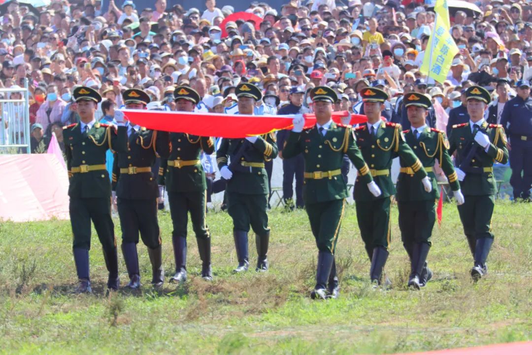 伴随着庄严的国歌声,鲜艳的五星红旗冉冉升起。赤峰市首届乌兰牧骑艺术展演会旗、巴林右旗第二十四届那达慕大会会旗也在空中迎风飘扬。