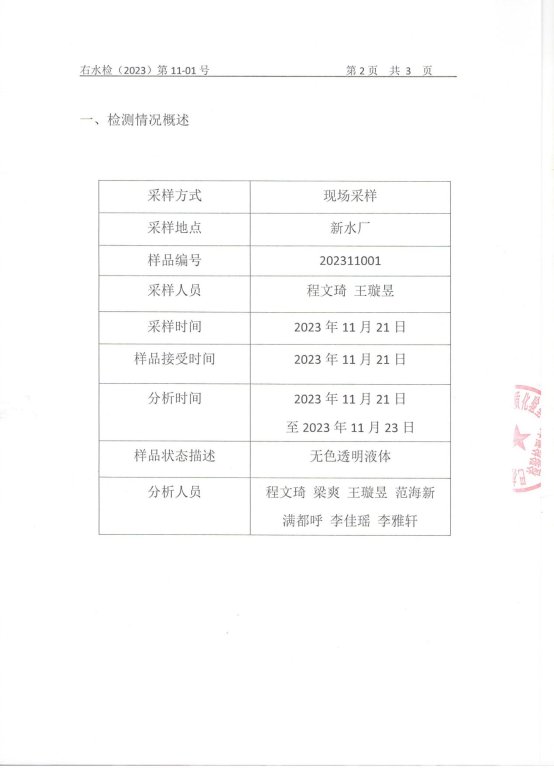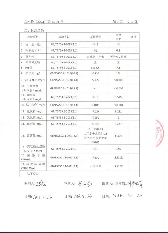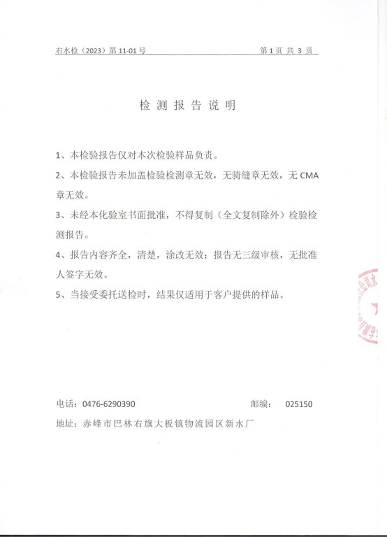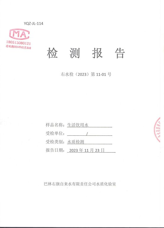 巴林右旗自来水2023年第四季度水质检测报告